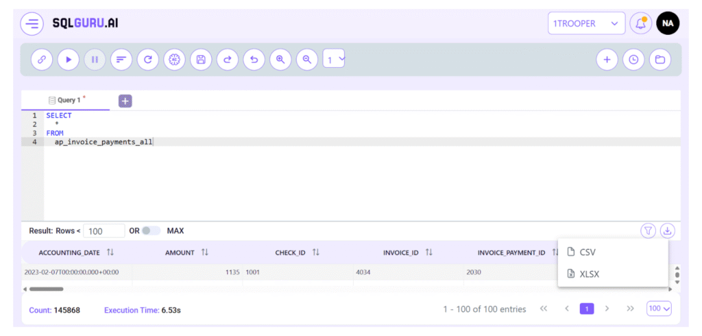 Export query results to Excel or CSV with a single click, streamlining reporting and enabling effortless data sharing.